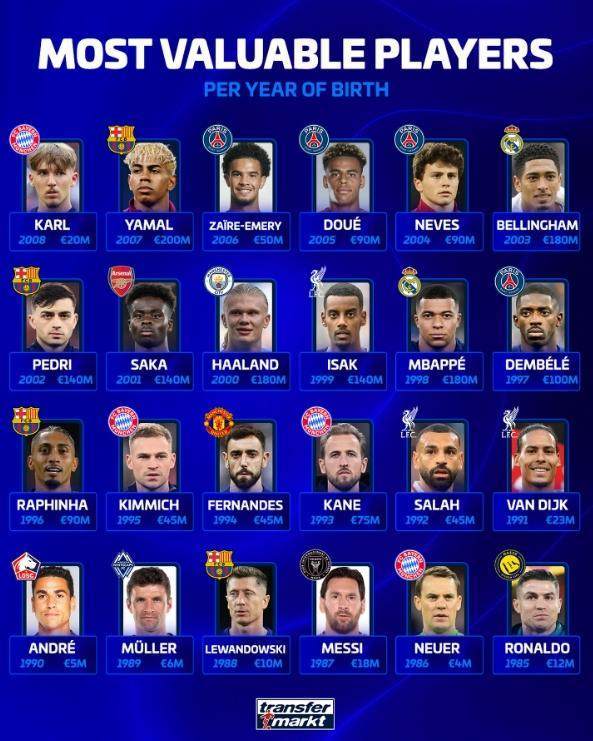 德转统计了各年龄段身价最高球员,其中,梅西、C罗、哈兰德、姆巴佩等人在列。各年龄段身价最高球员: